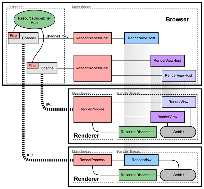 Chromium把管理页面、管理选项卡和插件的进程称为主进程。把特定于页面的进程称为渲染进程。