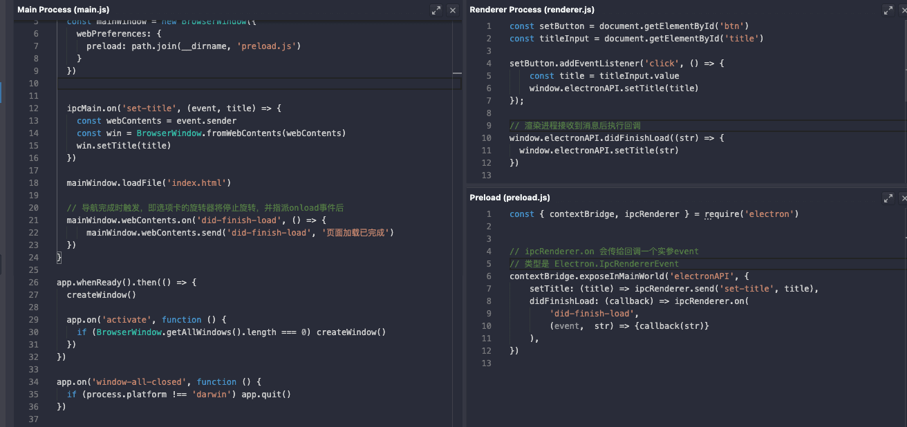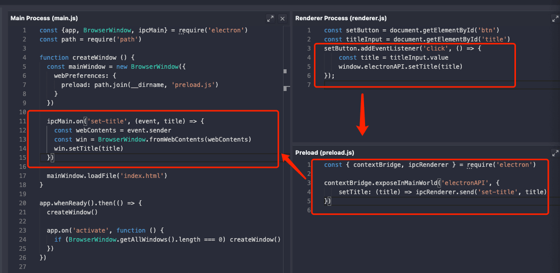 handleSetTitle回调函数有两个参数:一个 IpcMainEvent 结构和一个title字符串。 每当消息通过set-title通道传入时,此函数找到附加到消息发送方的 BrowserWindow 实例,并在该实例上使用win.setTitleAPI。通过预加载脚本暴露