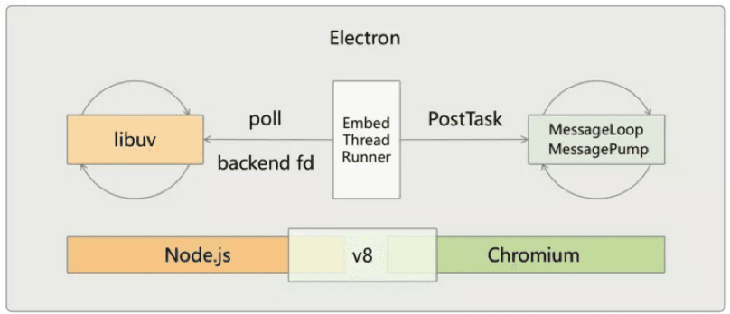 Electron则是通过新起了线程轮询libuv中来监听Node.js,一旦发现新的事件,就会立即上报到Chromium的事件循环中,唤醒主线程来处理这个事件。