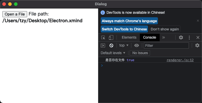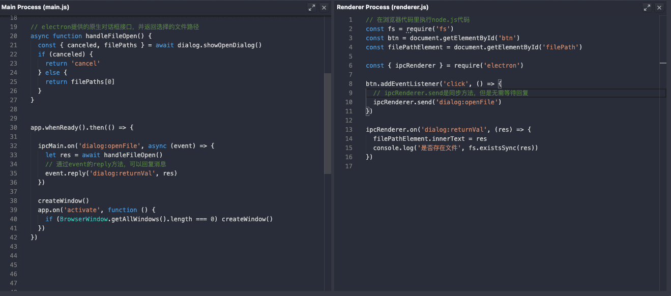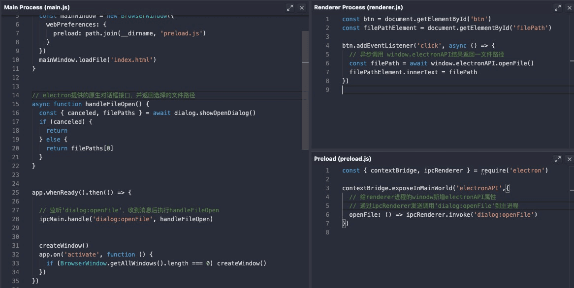 handleFileOpen()函数,它调用dialog.showOpenDialog并返回用户选择的文件路径值。 每当渲染器进程通过dialog:openFile通道发送ipcRender.invoke消息时,此函数被用作一个回调。 然后,返回值将作为一个 Promise 返回到最初的invoke调用。IPC 通道名称上的