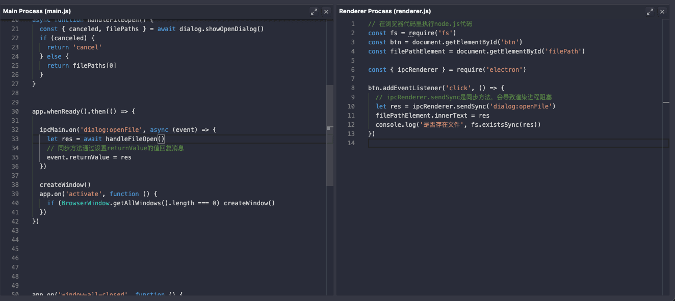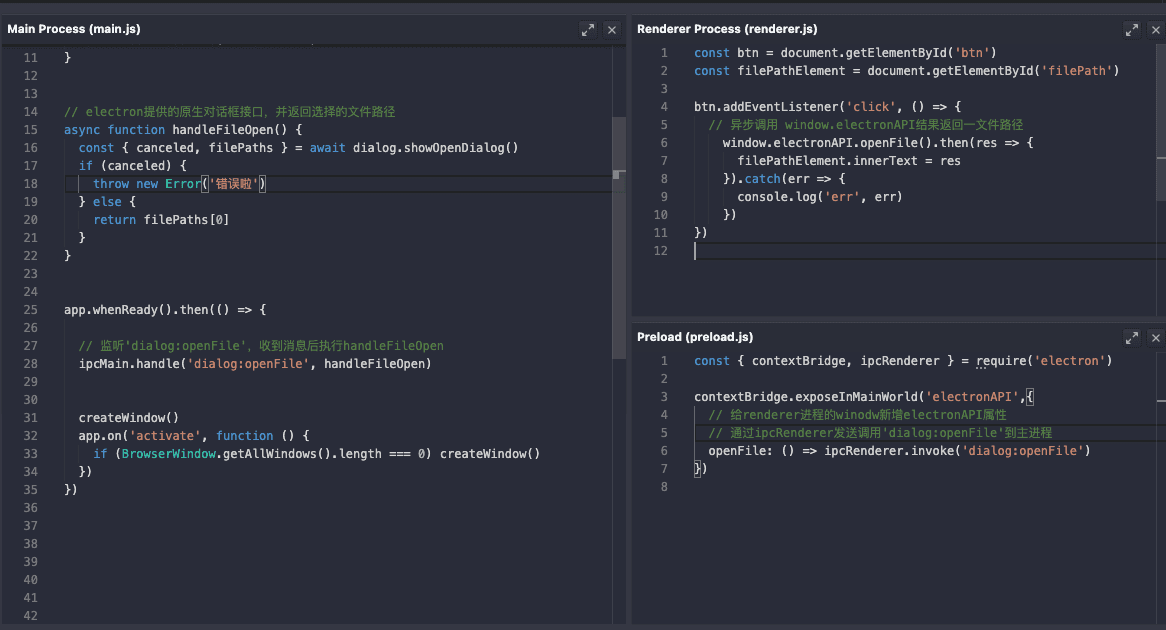 ipcRenderer.sendAPI。默认情况下,渲染器进程没有权限访问 Node.js 和 Electron 模块。 作为应用开发者,您需要使用