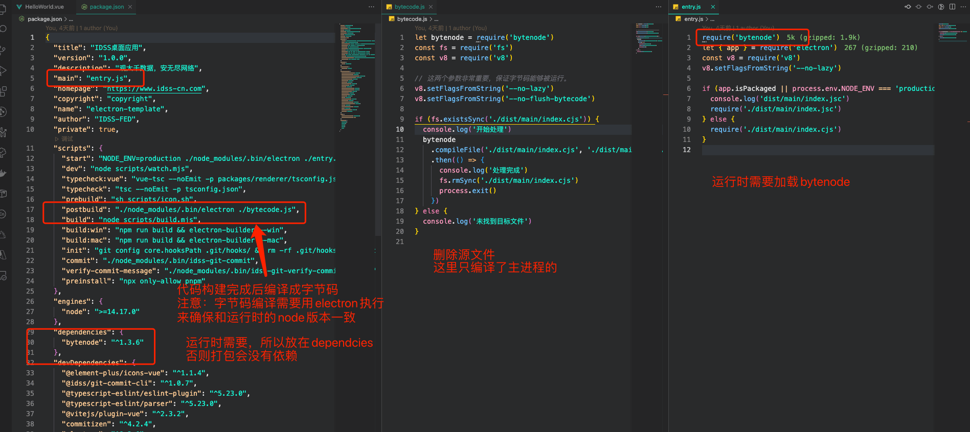 v8 字节码格式的和 v8 版本和环境有关,不同版本或者不同环境的 v8,其字节码产物不一样。Electron 存在两种进程,Browser 进程和 Renderer 进程。两种进程虽然 v8 版本一样,但是由于注入的方法不同,运行环境不同,因此字节码产物也有区别。在 Browser 进程中生成的 v8 字节码不能在 Renderer 进程中运行,反之也不行。当然,在 Node.js 中生成的字节码也是无法在 Electron 上运行的。因此,我们需要在 Browser 进程中构建用于 Browser 进程的代码,在 Renderer 进程中构建用于 Renderer 进程的代码。